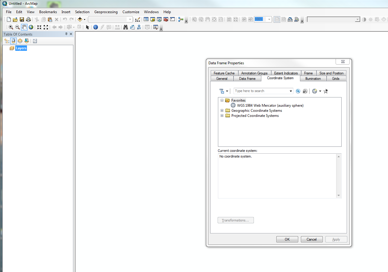 - Open a map document in ArcMap. Change the coordinate system of the data frame (“Layers” in the example below) to WGS 1984 Web Mercator (auxiliary sphere). This option is found under Projected Coordinate Systems -> World -> WGS 1984 Web Mercator (auxiliary sphere).