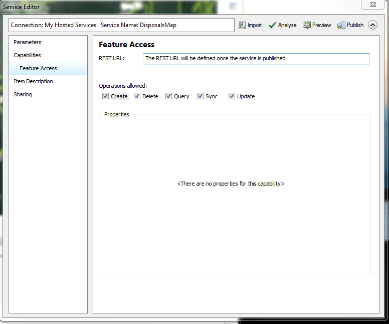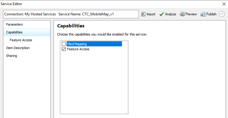 - Under Capabilities, check Feature Access and uncheck Tiled Mapping.
