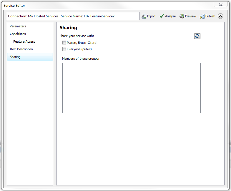 - Share the feature service by navigating to File -> Share As -> Service. Select ‘Publish a service’ and name the service (pick a short name, all lower case with no spaces). Work your way down the left panel.