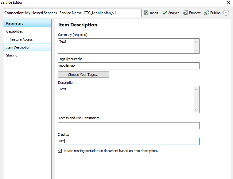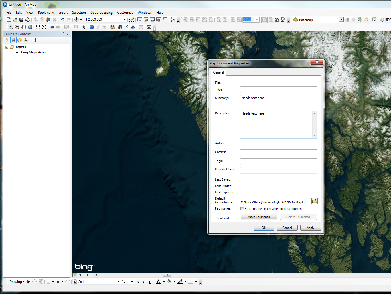 - Add metadata to the Map Document Properties (File -> Map Document Properties) Summary and Description boxes (this is required for the Create Map Tile Package Tool) and save the map.