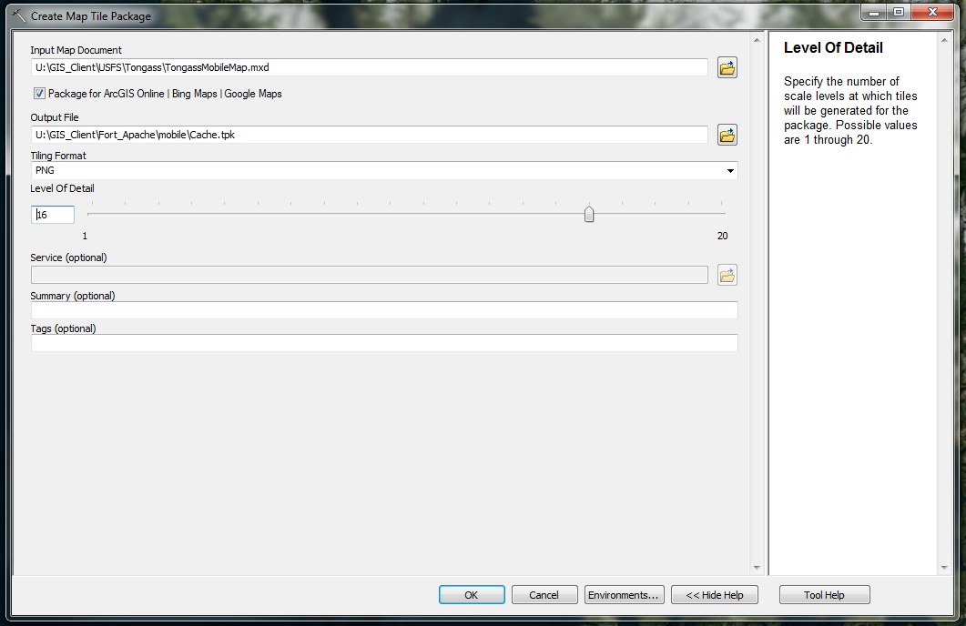 Esri Tile Packages (TPK) are tiled images stored at multiple zoom levels. The zoom levels follow the standard Esri/Google/Bing tiling system which is best described here . This tiling system uses the Web Mercator projection and zoom levels range from 1 (lowest resolution, whole earth stored in 4 tiles that are 256 pixels x 256 pixels each) to 23 (highest resolution, each pixel represents 1.87 cm of the Earth's surface). There are several ways to create TPKs, including in ArcMap, ArcGIS Pro and MobileMap. The sections below describe the process for creating TPKs in ArcMap and MobileMap.