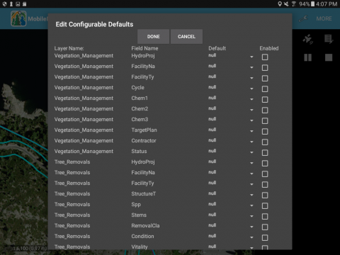 This opens the configurable defaults menu. This lists every field that uses a select list (rather than free text) by layer. For any fields for which you’d like to use configurable defaults, simply select the value from the select list and verify that the ‘Enabled’ box is checked. Select ‘Done’ and start collecting data with your configurable defaults.