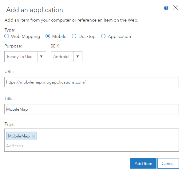 - Set 'MobileMap' as a tag, and add any additional tags that will help administrators search for this item